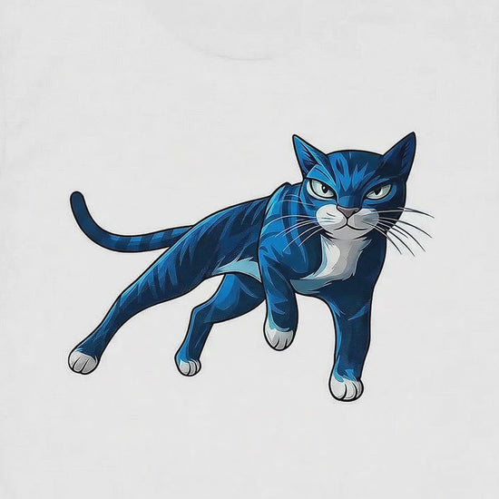 - Design: Einfarbiges Statement mit auffälliger, blauer Katzen-Grafik, die auf Schwarz, Weiß oder Grau besonders gut zur Geltung kommt.